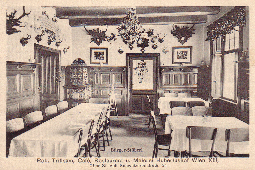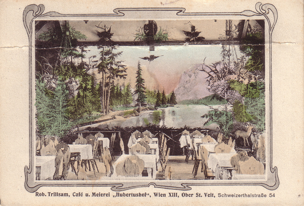 Ansichtskarte des Hubertushofs in der Schweizertalstraße 54 (Ecke Ghelengasse / Prehausergasse).