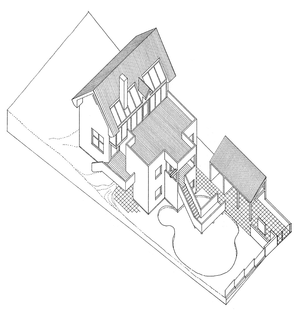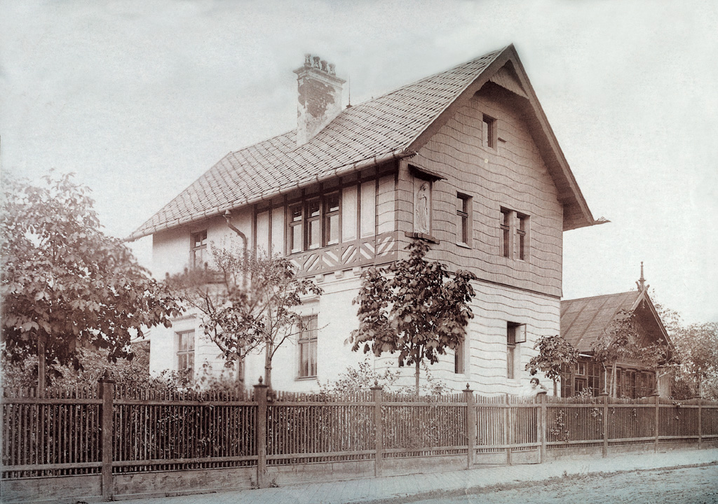 Villa Baumann. Straßenseite mit Gartenhaus und verglaster Verbindungswand.