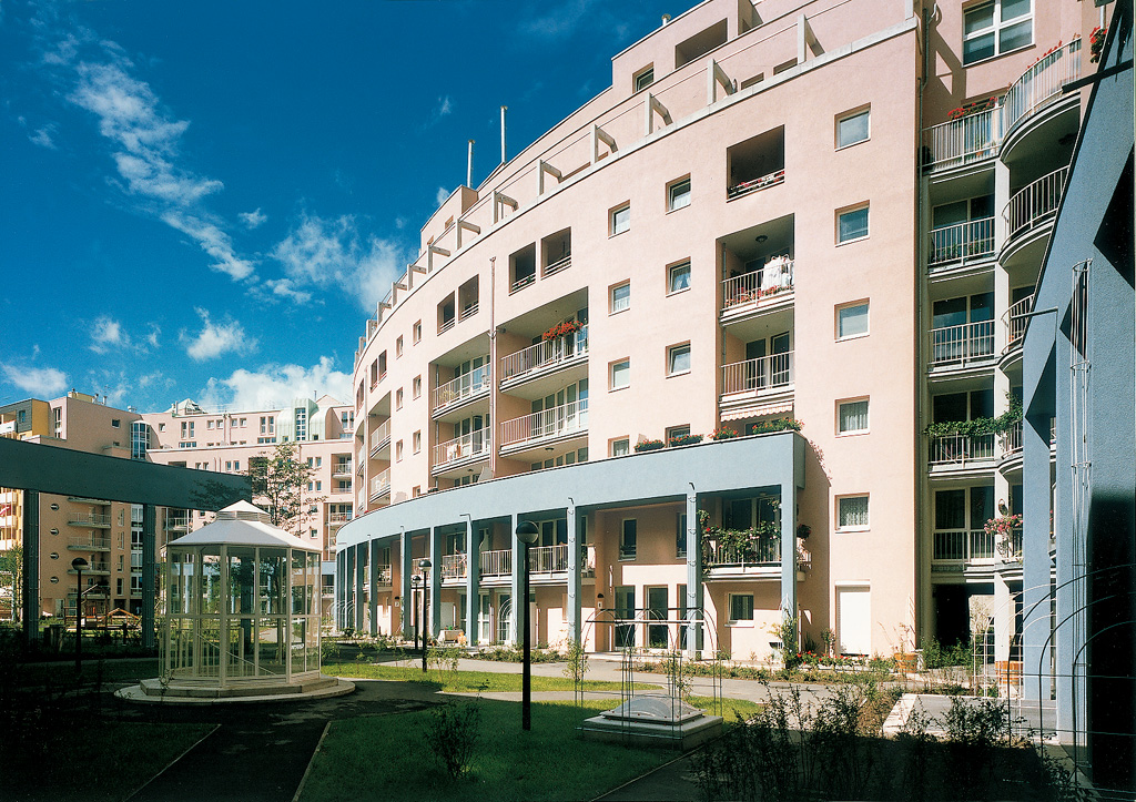 "Käthe Leichter-Hof". Bogentrakt. Im Hintergrund Straßentrakt gegen den Hietzinger Kai. Im Vordergrund Wohnhof.